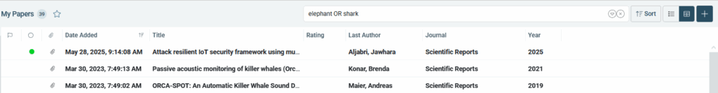So all of the above papers must include elephant and shark somewhere in the fields. If you want references about elephants or sharks you would use the OR query. elephant OR shark. OR needs to be capitalized to work.