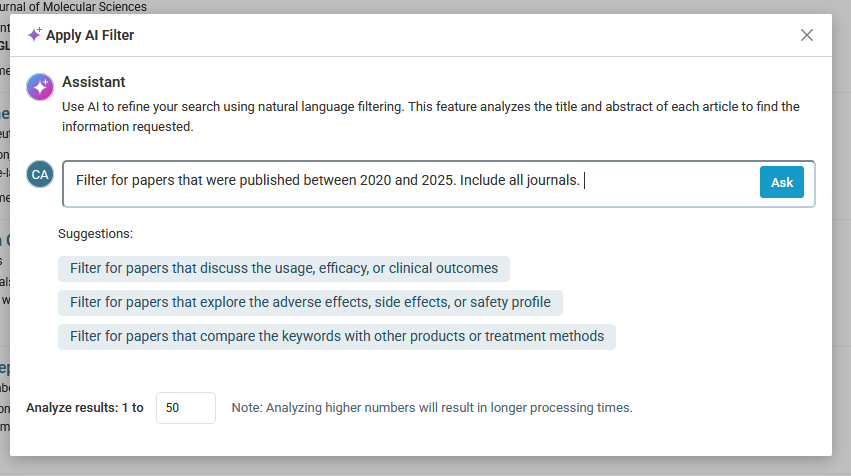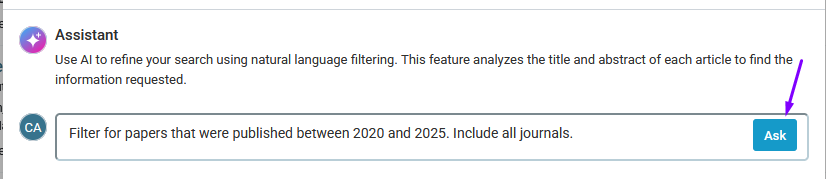 4. Click ‘Ask’ to filter your results, bringing high-priority studies to the top and minimizing manual sifting.