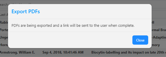 Once you have made you selection, a popup will appear informing you that those PDFs are being exporting and that an e-mail with a link will soon be sent to the e-mail address you have on file with ReadCube.