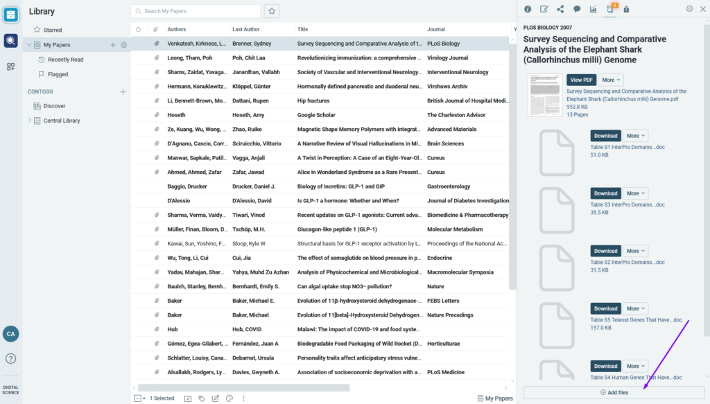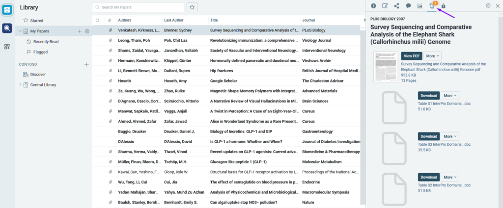 When you select a reference in your library, the right side panel will open. At the top of this panel is a number of options for the article, including the “Files” option. Select this option to see all files associated with that reference: