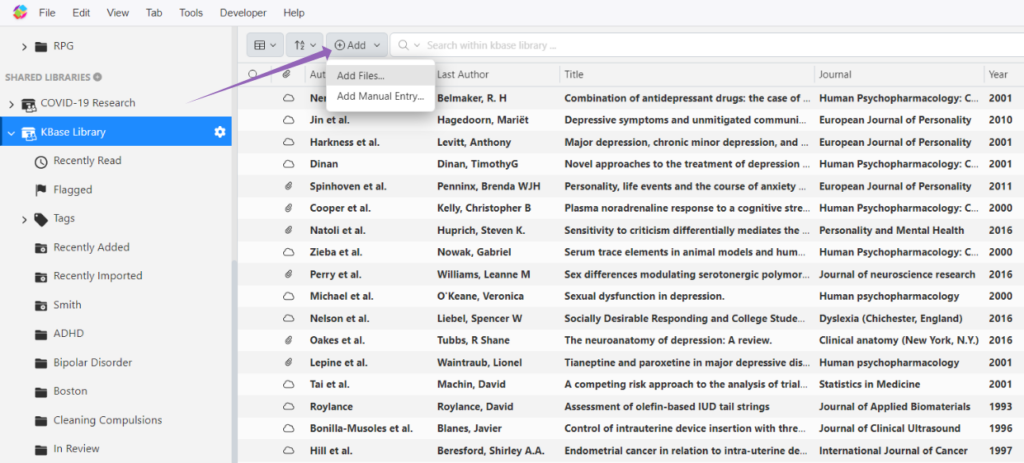 You can also manually attach PDFs (or supplements) by navigating to the “Files” section of a selected reference: