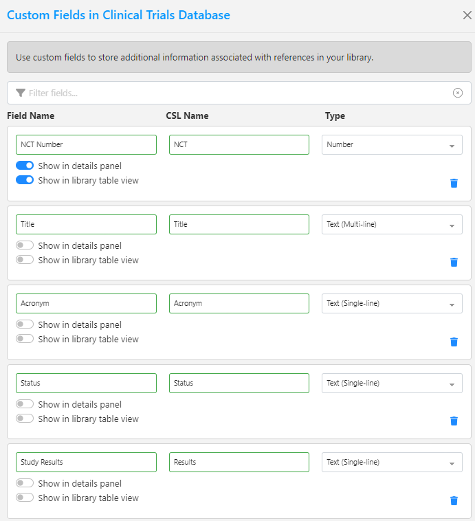 Medical devices: If you want to add the device manufacturer or device trade name that each of the articles in your library relates to, you can create a custom field.