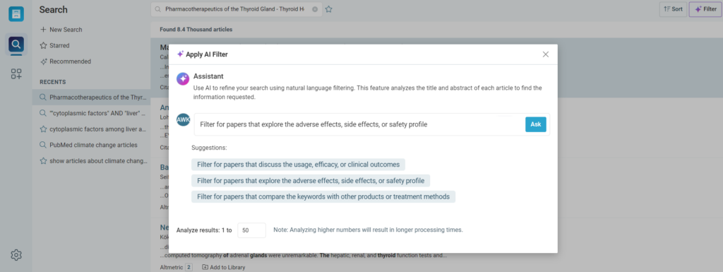 After launching the “Filter” tool from the top right corner of the screen, you can write your own plain-language query or select from a list of suggested prompts, such as “Filter for papers that explore the adverse effects, side effects, or safety profile.” See the screenshot example below.